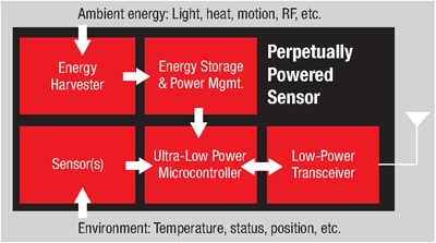 A system powered by a small battery — or micro-energy harvesting device — will need to communicate information to another system or to a central collection point. Supplying power to a network of sensortransmitters has traditionally required expensive wiring installation or routine battery changes. Gathering data from difficult or dangerous-to-reach locations using wired sensors may be impossible and or even compromise the safety of personnel installing wiring and replacing batteries.