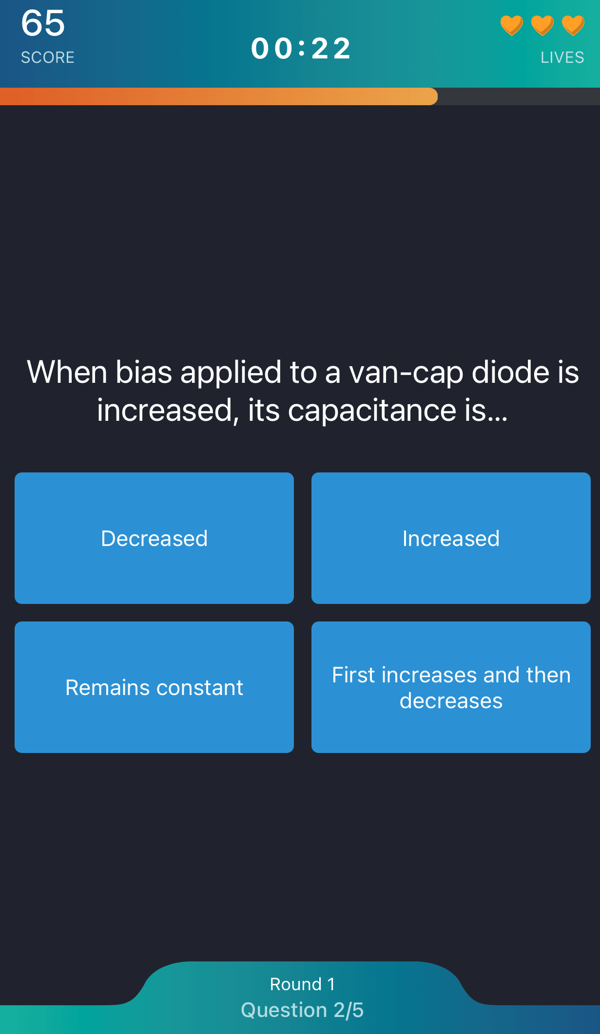 When you're done with the tutorial, it's game time. Tap Try Game! You’ll start each game with three lives. After a countdown, the game loads and serves up a question in which you have one full minute to answer (no fair Googling). You get five questions, and they can vary from easy to difficult. For every question answered correctly, you accumulate points and can keep working your way up the leaderboard. Three wrong answers are like three strikes–you're out.