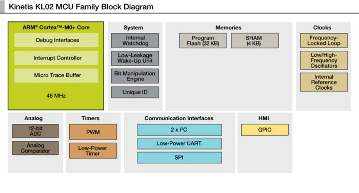 Freescale's Kinetis KL02 Chip Scale Package (CSP) ARM Cortex-M0+ MCU is the world's smallest ARM powered MCU which is built on the ARM Cortex-M0+ processor and combines the world's smallest package size with unparalleled energy-efficiency and feature integration. This MCU package uses 25% less PCB area than the nearest competing product with 60% more GPIO. Energy-saving architecture is optimized for low power with 90nm TFS technology, clock and power gating techniques, low power boot option, bit manipulation engine, peripheral bridge crossbar and zero wait state flash memory controller. Several, flexible power modes fit for different application use cases designed to maximize battery life. It also includes a rich mix of connectivity, analog and timers not found in any other MCU of it's kind.