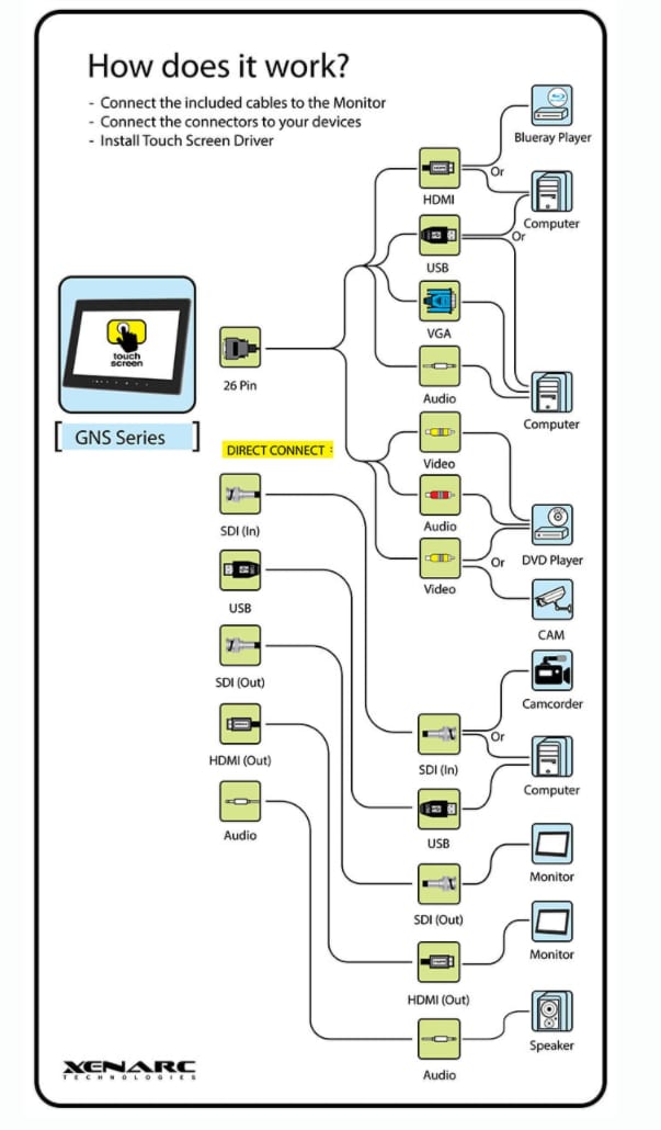 The 1219GNS offers video interface through a 26-pin cable (HDMI, VGA, AV inputs)with SDI and HDMI direct into the monitor. The 1219GNH monitor does not provide an SDI input.