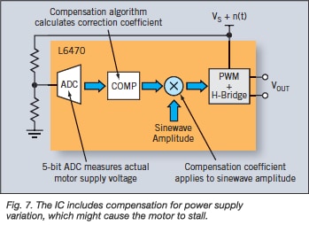 When operating on an unregulated power supply, there may be a significant amount of ripple on the supply voltage to the motor driver circuitry. As the supply voltage varies, the motor current will also vary. If the ripple on the supply voltage is significant, then there is a risk of stalling the motor if the motor current falls too low. The device compensates for the power supply variation, as shown in Fig. 7. In this circuit, an internal A/D converter measures the power supply voltage, and then the algorithm in the digital core calculates an appropriate compensation factor that is applied to the PWM duty cycle to maintain a constant output voltage over the variations in supply voltage.